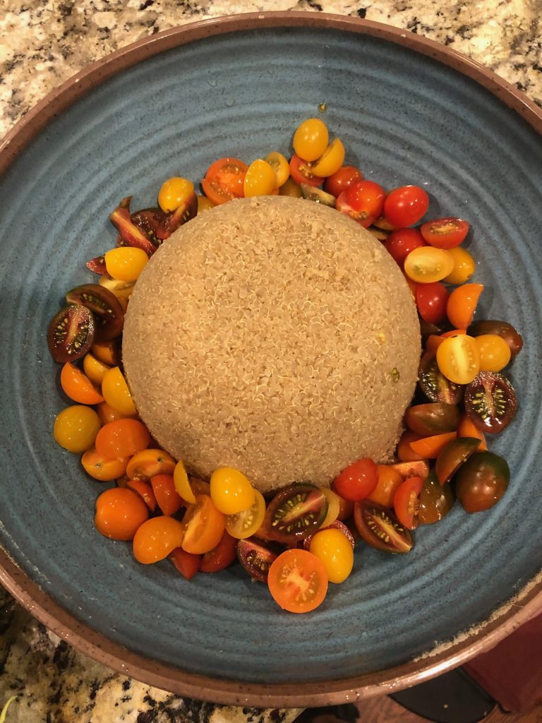 - I the salad bowl, transfer the quinoa . Turn the stainless steel bowl over in the bowl and remove the bowl: Kids love it as it looks like a little mountain! I do that often with bowls or when I cook grain in a savarin mold, it is a fun decoration for dinner and gives it flair.