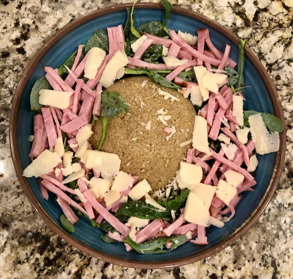 - While quinoa cooks, cut ham, tomatoes, kale, and slice cheese on a board.