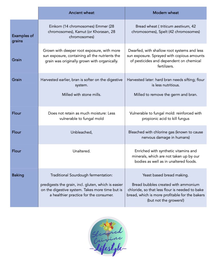 Our family’s choice is to pay more, but use less ancient wheat that we otherwise would if it was modern wheat. We use no modern wheat in our diet except exceptionally (like when eating out or potlucks!) We also use wheat alternatives like (sifted) buckwheat, whole rice and rice flour, almond meal and flour, teff flour. Vary the sources also means varying the nutrient intake, the tastes, it makes life more interesting for our palates.